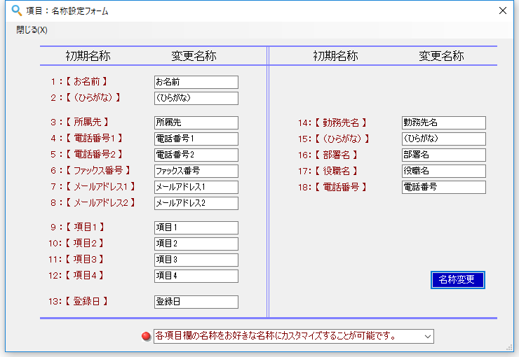 ・入力フォームのメニューバー 設定(S) ⇒ 項目:設定 より 以下の項目名称が変更可能です。