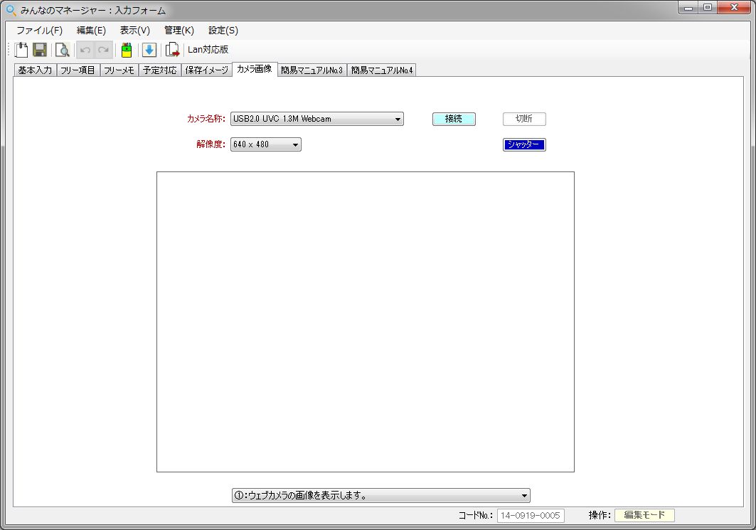 WEBカメラを搭載したパソコンであれば、カメラ画像を「入力フォーム:保存イメージ」タブに登録・保存する事ができます。